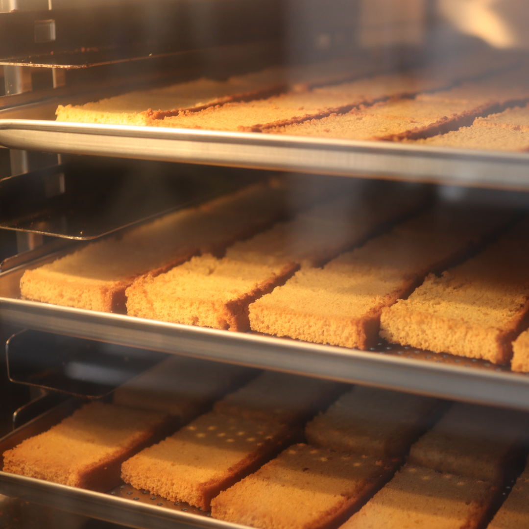 1枚1枚、レンガに見立ててカステラをカットし、乾燥焼き、秘伝のバターを1枚づつしっかりと塗りオーブンでこんがり焼いて完成!空気を含んでいるので固くないラスクです。